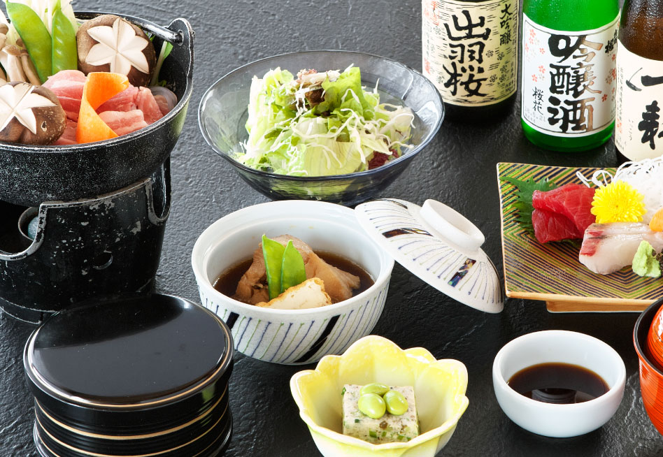 小鉢・お刺身・焼物又は揚物・温物・香の物・味噌汁・ご飯(全七品)